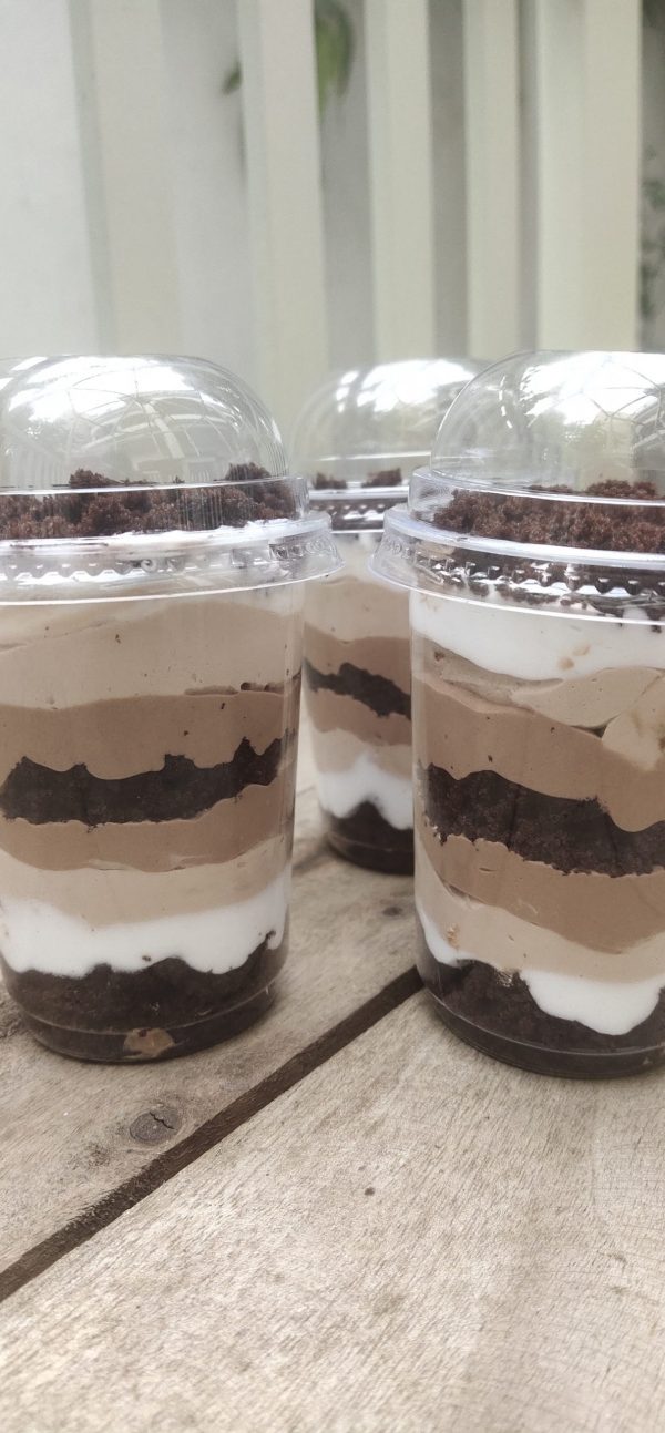 Creamy Layered dessert with crushed brownies, vanilla, chocolate and coffe flavoured layers